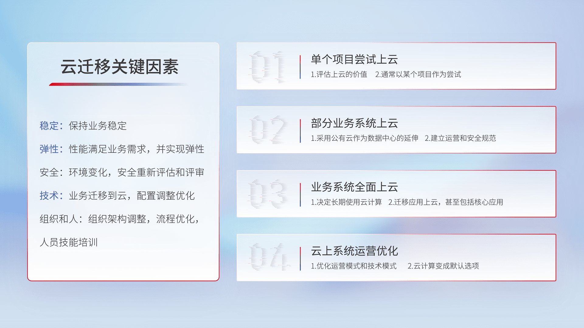 结合实际业务,,,,从规划设计、、云平台选型、、云原生改造、、数据迁移、、集成交付,,迁移全过程为客户识别最佳上云路径,,,,做好风险识别管理,,,设计网络架构、、、身份权限、、、安全审计合规、、操作审计、、日志审计、、、监控告警策略、、、多站点容灾设计等,,对云上基础设施进行整体规划,,,,提升IT治理水平,,以满足弹性、、高可用、、、高性能的需求。。