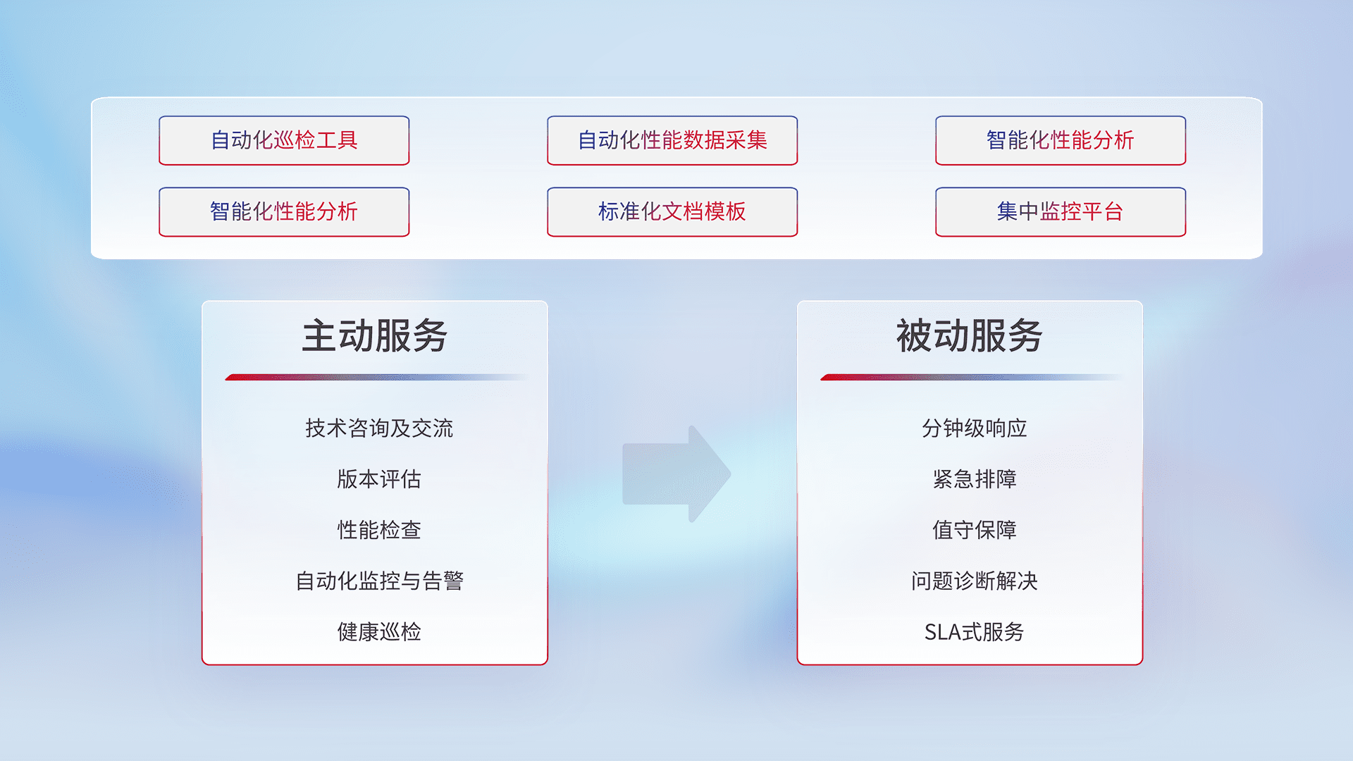 智能化工具和标准化文档,,,保障服务质量,,,提供主动服务(包含技术咨询、、、版本评估、、、、性能检查、、自动化监控与告警、、健康巡检)和被动服务包含(分钟级响应、、紧急排障、、、、值守保障、、、、问题诊断解决、、、SLA服务)。。。。